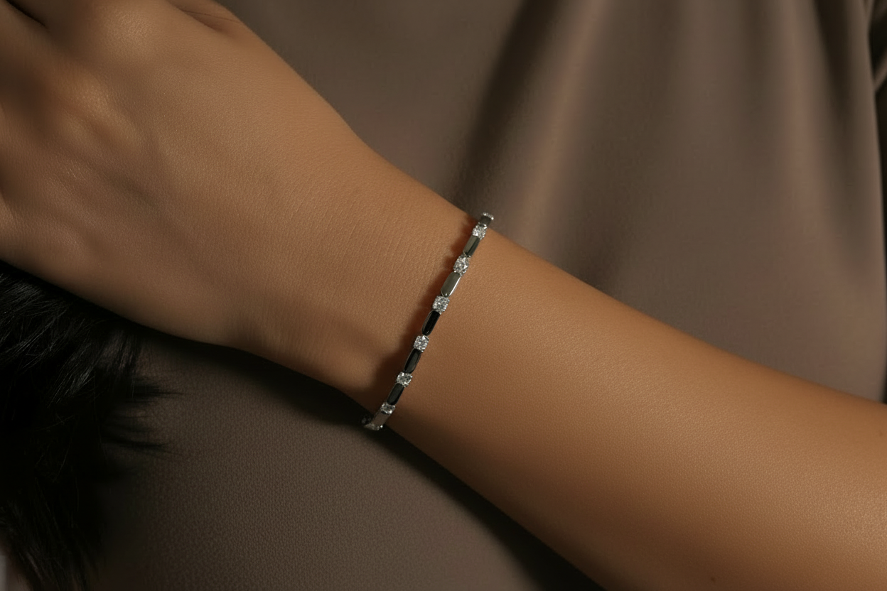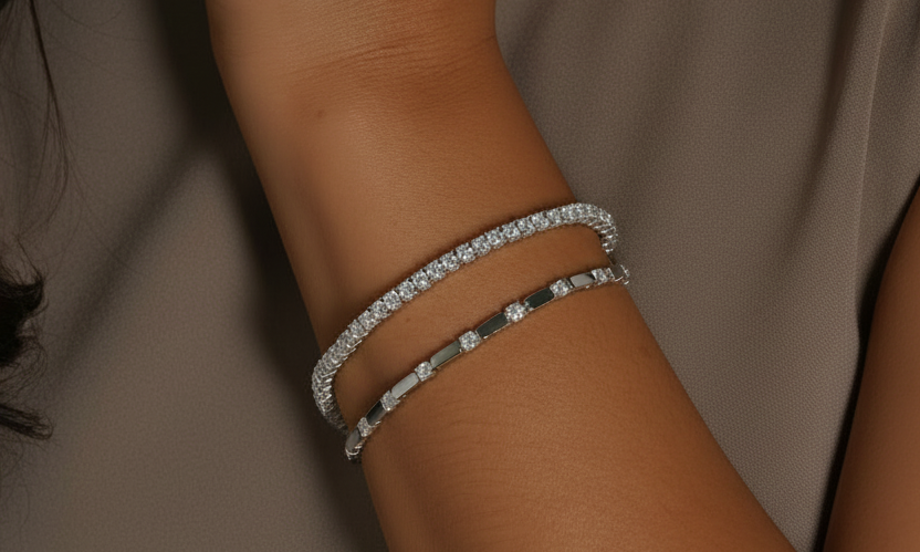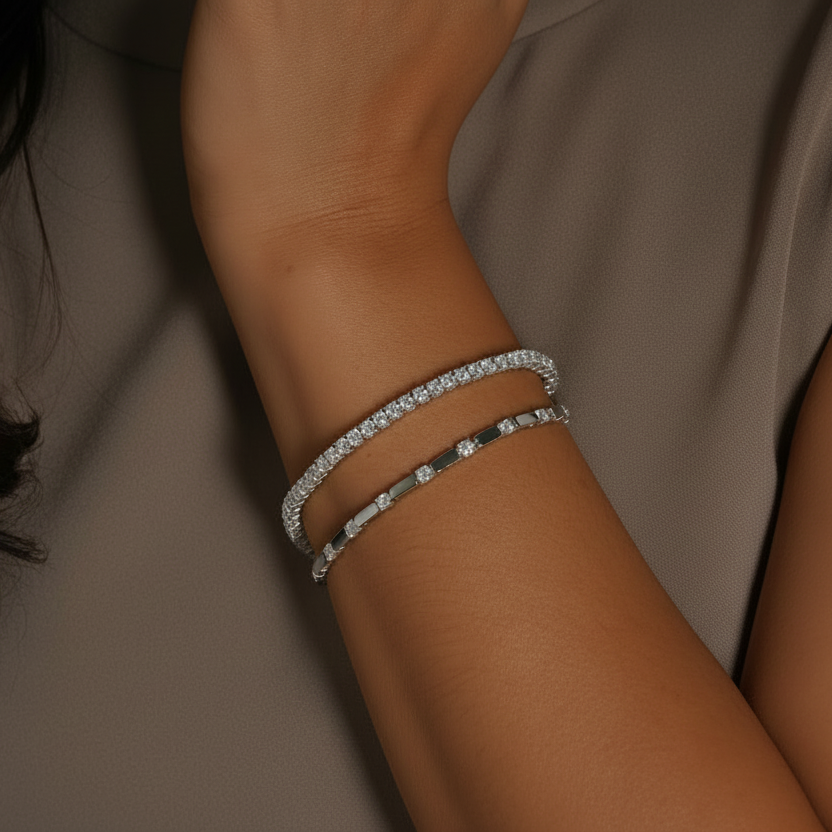 Featuring round-cut moissanite gemstones set in a classic sterling silver line design, secured with a durable clasp for lasting wear. A must-have piece for every jewellery collection.